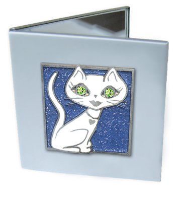 The White Pretty Kitty emblem is hand cast pewter and each color is individually hand colored with durable enamel. This attractive mirror compact is constructed of aluminum in a stylish matte finish. The case measures 3 1/2 x 3 1/2". Inside there are two mirrors one which is a magnifying mirror. Great gift for those girls on the go.